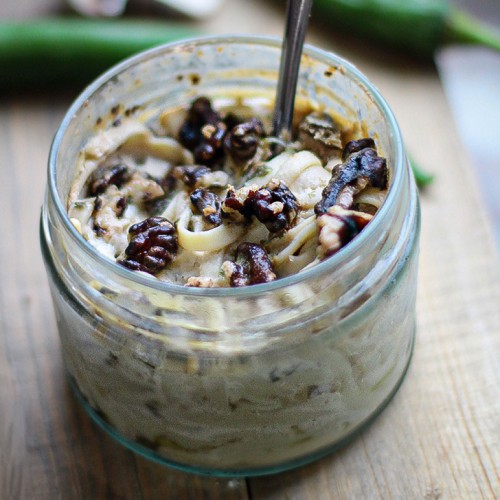 Pâtes nappées d’une sauce crémeuse au gorgonzola, avec courgettes fondantes et éclats de noix croquants..