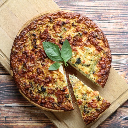 Une grande quiche maison coupée en parts