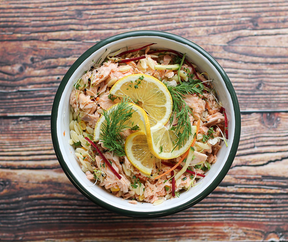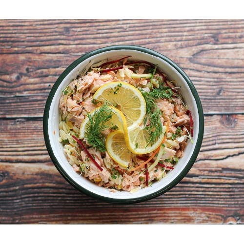 Duo de saumon d'Atlantique cuit et fumé, salade de pâtes aux petits légumes : carottes, haricots verts, petits pois, maïs, vinaigrette au citron