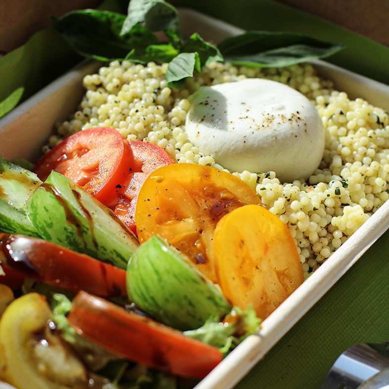 Ingrédients : Salade de lentilles, mesclun, mozzarella, légumes de saison, crème balsamique.