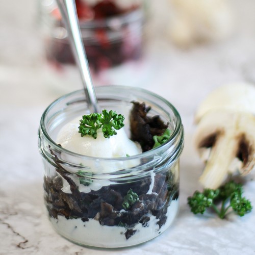 Maximize Champignons de paris, pleurotes, crème épaisse, ciboulette, échalotes et œuf poché.