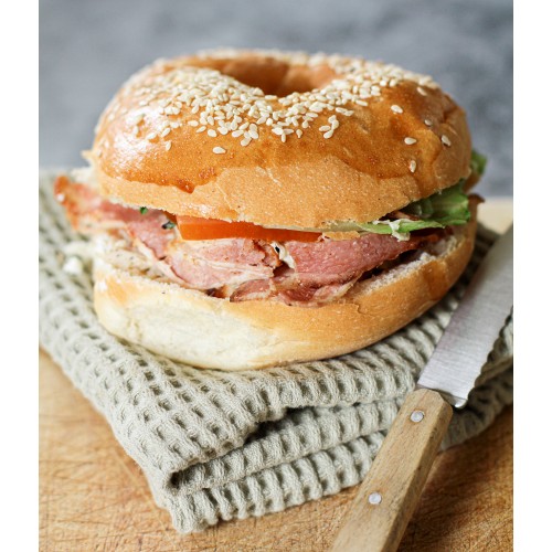 Ingrédients : bagel (farine BLE, eau, beurre (LAIT), LAIT, sucre, sel, levure,graine de SESAME, OEUF, améliorant), fromage fouetté (BABEURRE, CREME, LAIT écrémé, sel de Guérande (1,1%), babeurre déshydraté (lait), protéines de LAIT, ferments LACTIQUES), filet de poulet roti (viande de poulet origine UE ou hors UE, eau, dextrose, sel, amidon transformé de manioc, stabilisant : E451, gélifiant : E407), bacon (poitrine de porc, sel, maltodextrine, conservateur : E250, fumée de bois de hêtre), tomates, mesclun (mélange de feuilles et de jeunes pousses de salades), grana padano (LAIT, sel, présure, conservateur : lysozyme d’ŒUF).